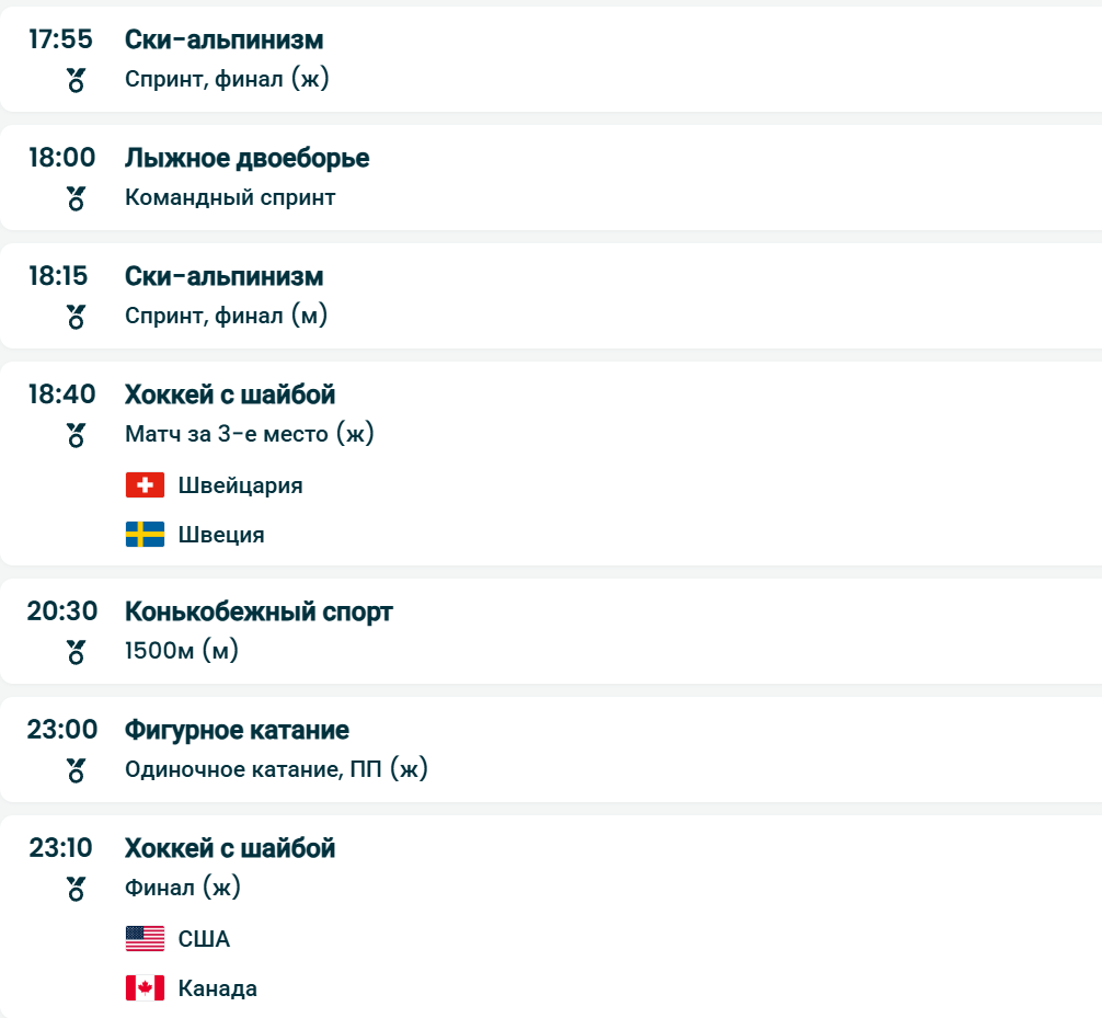 Программа 12-го дня включает финалы в ски-альпинизме, лыжном двоеборье, женском хоккее, конькобежном спорте, фристайле и женском фигурном катании.