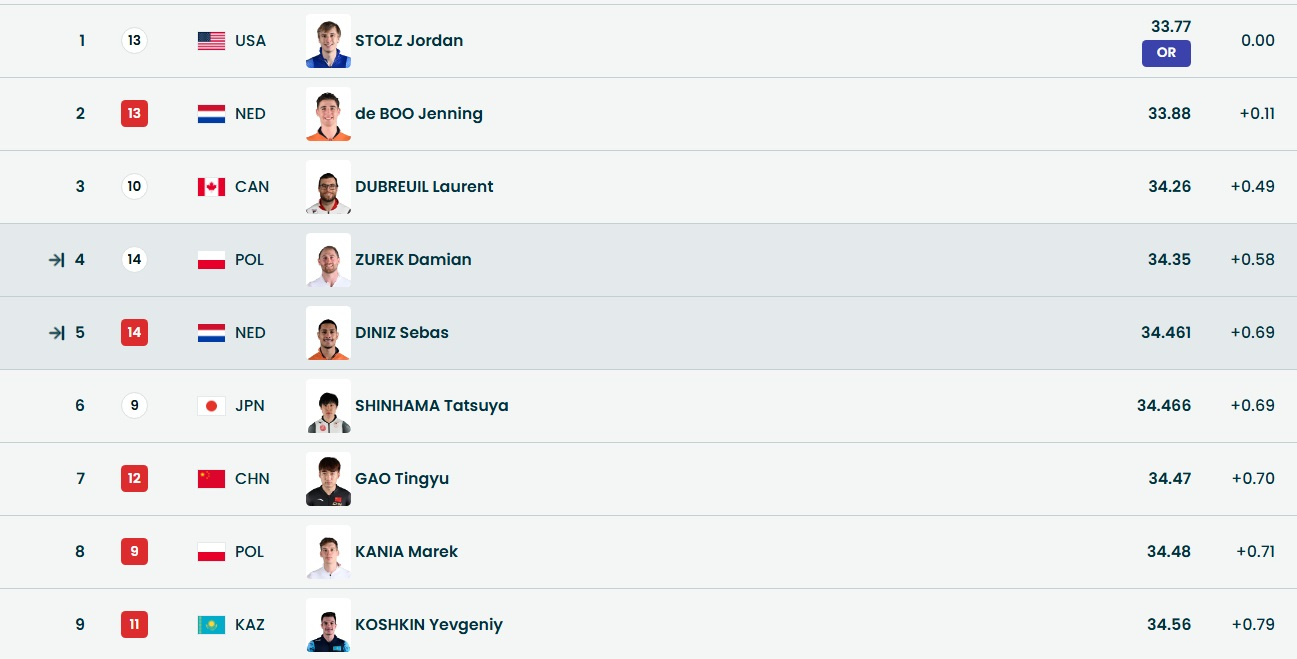 Результат казахстанца на его дебютной Олимпиаде - 34.56. Отставание от победителя составило - 0.79 секунды