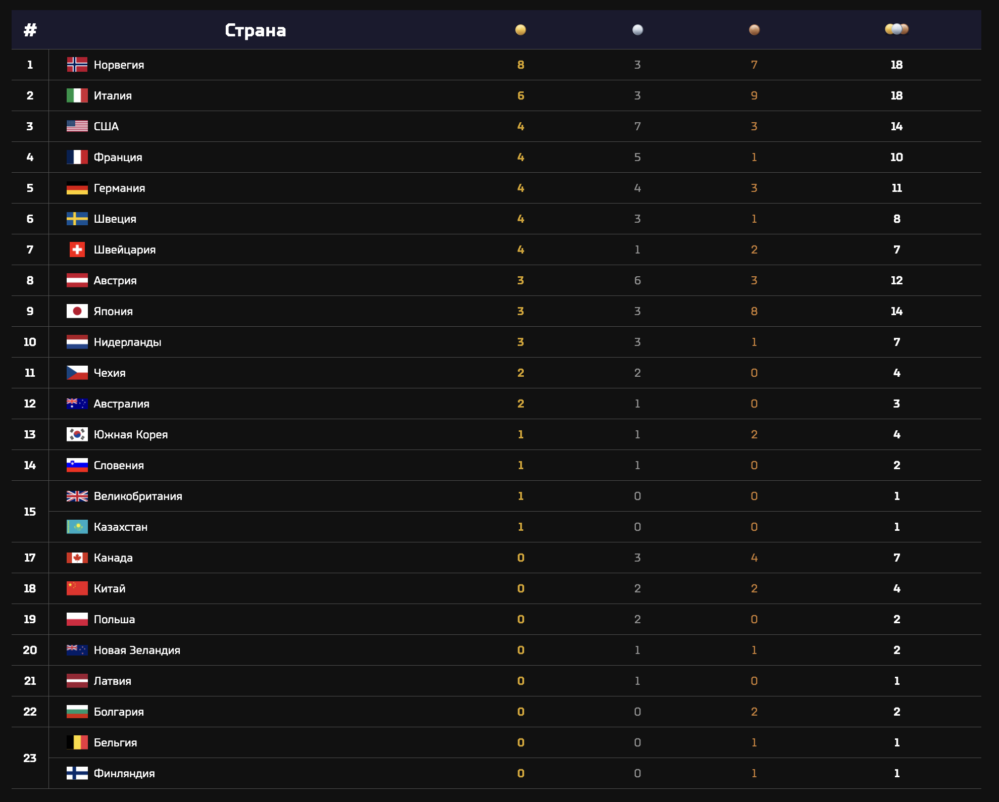 Лидирует в медальном зачете Норвегия, у которой восемь золотых, три серебряных и семь бронзовых наград. На второй строчке Италия с шестью золотыми тремя серебряными и девятью бронзовыми медалями. Тройку лидеров замыкает США, у которых четыре золота, семь серебра и три бронзы.