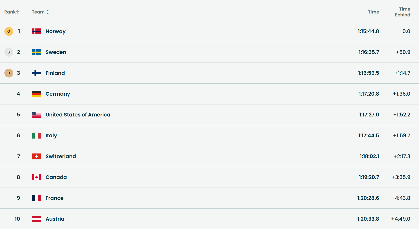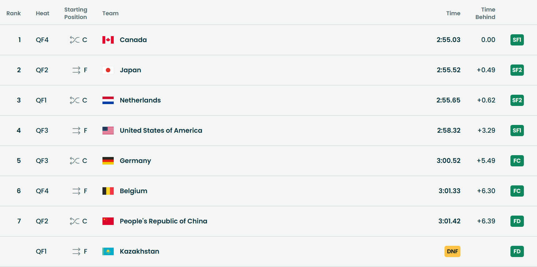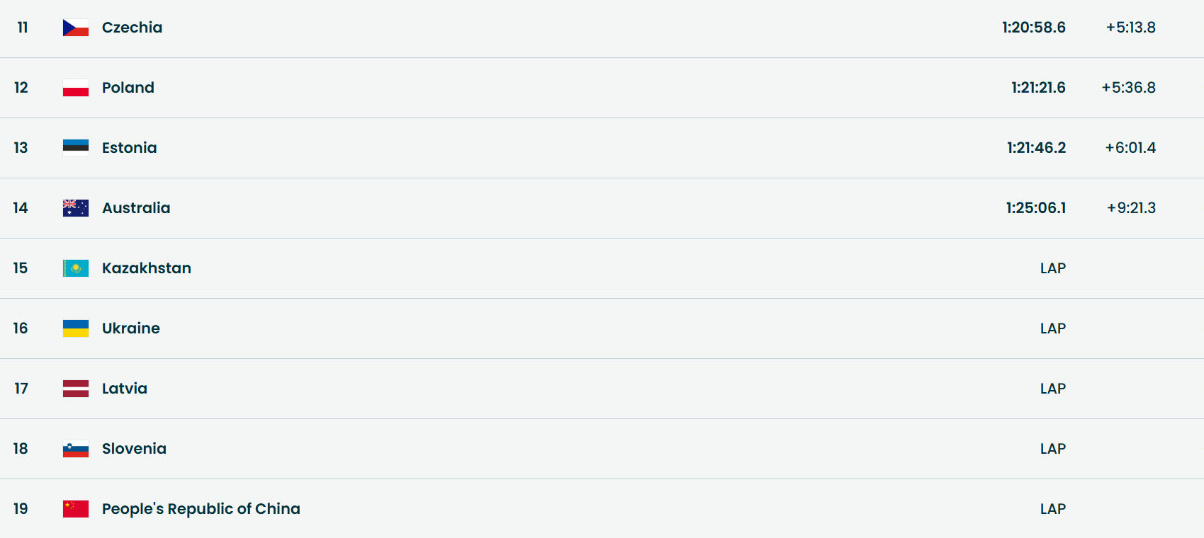 Сборная Казахстана (Елизавета Голубева, Надежда Морозова, Арина Ильяшенко) не смогла завершить гонку с Нидерландами из-за падения и 17 февраля разыграет 7-8 место с Китаем.