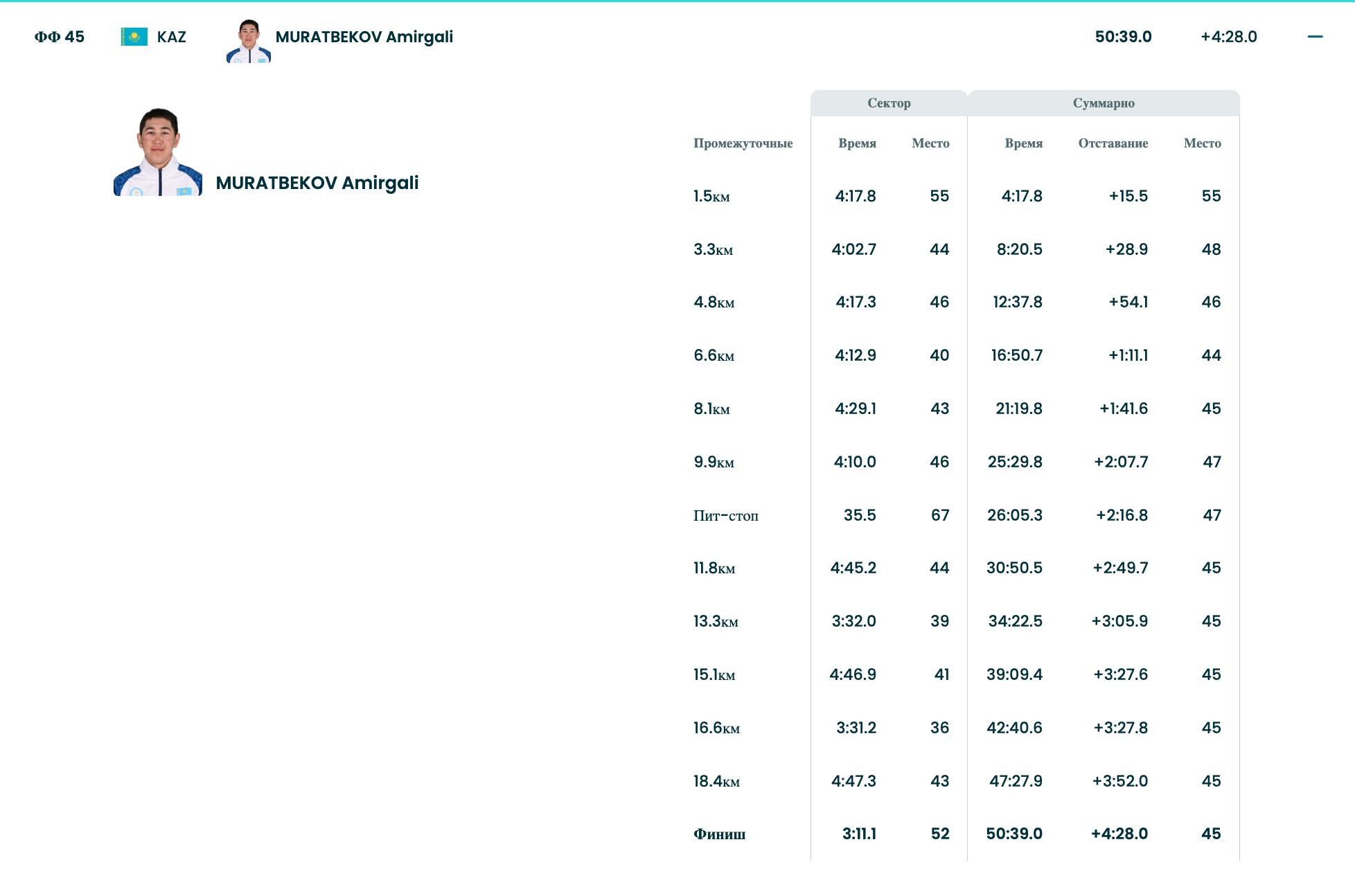 От Казахстана в скиатлоне бежали Амиргали Муратбеков, финишировавший 45-м, и Наиль Башмаков, который показал 49-й результат.