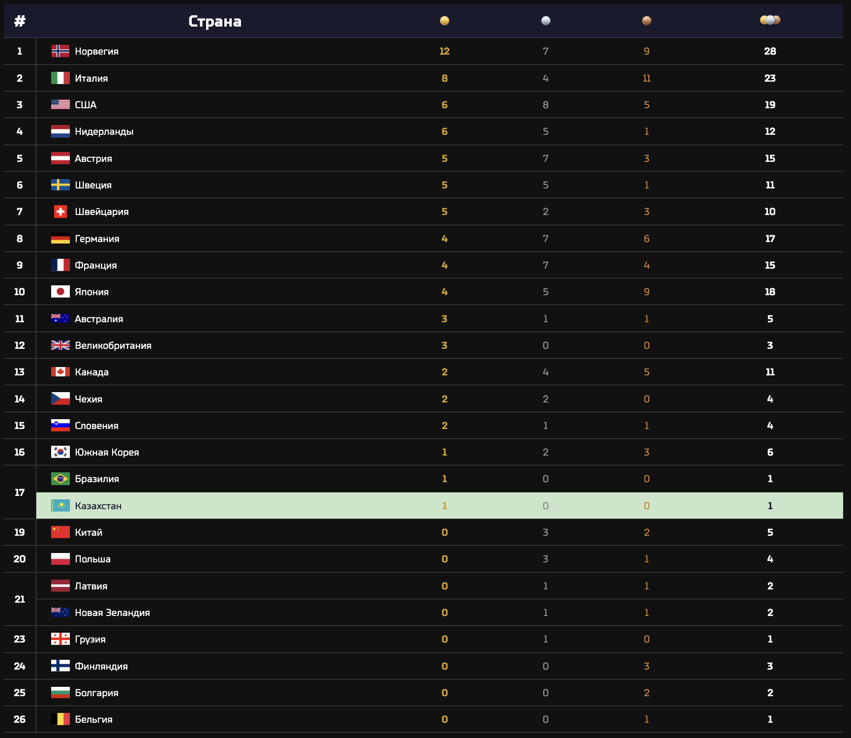 Сборная Казахстана сохраняет 17-е место в медальном зачёте, деля позицию с Бразилией. Китай по-прежнему располагается ниже в таблице.