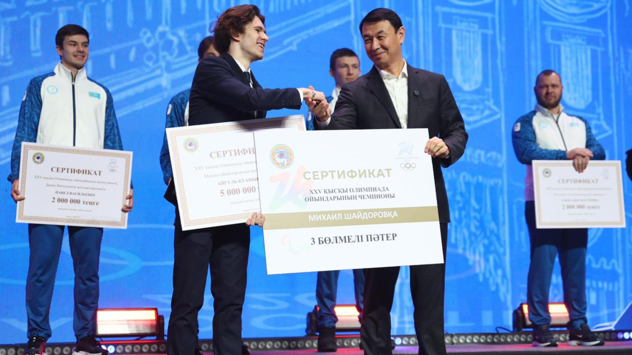 Аким Алматы Дархан Сатыбалды вручил спортсмену сертификат на трехкомнатную квартиру, ключи от новой машины и сертификат на 5 млн тенге.