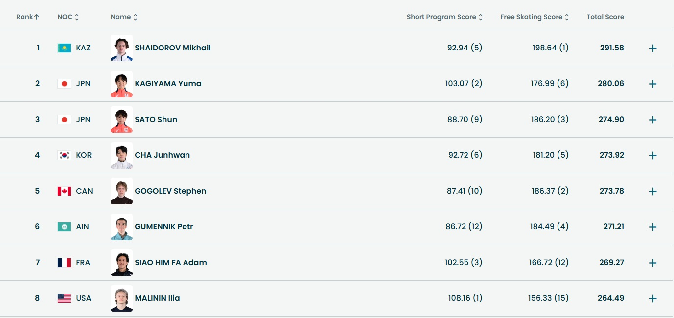 Благодаря выступлению в произвольной программе Шайдоров обошел Юму Кагияму, Адама Сяо и Даниэля Грассля и стал вторым, позади Ильи Малинина. В последнем выступлении Илья Малинин, лидировавший после короткой программы, допустил ряд ошибок и получил лишь 15-й результат, а в итоге стал лишь восьмым.