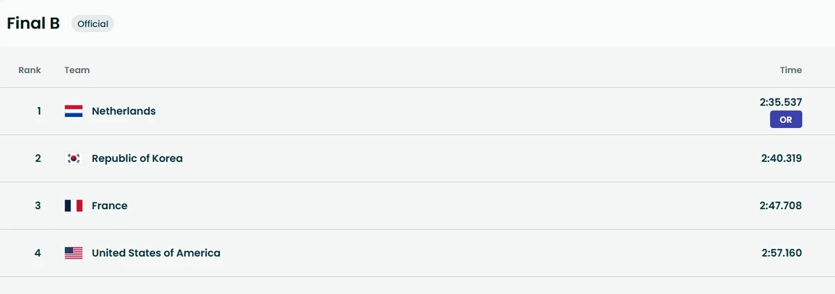 Нидерланды не смогли пробиться в решающий заезд по итогам полуфиналов. Но в утешительном финале установили новый рекорд - 2.35.537.