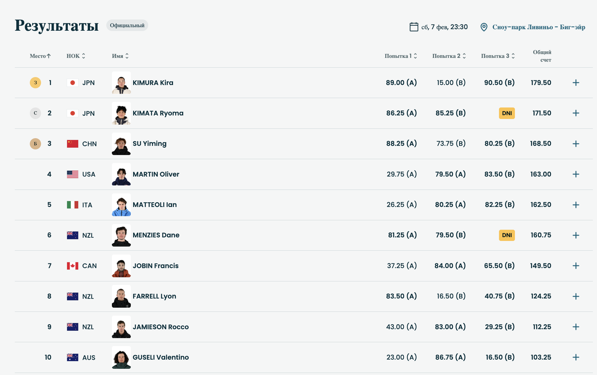 - 🥇 - Кира Кимура (Япония) - 179.50 (сумма двух лучших попыток),