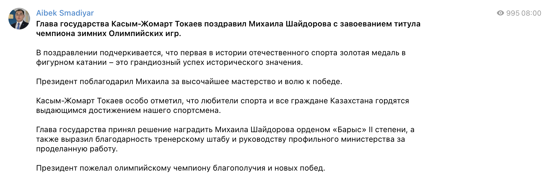 В поздравлении отмечается, что первая в истории отечественного спорта золотая медаль в фигурном катании стала грандиозным достижением исторического масштаба. Глава государства подчеркнул, что победа Шайдорова является результатом высочайшего мастерства, самоотдачи и воли к победе.