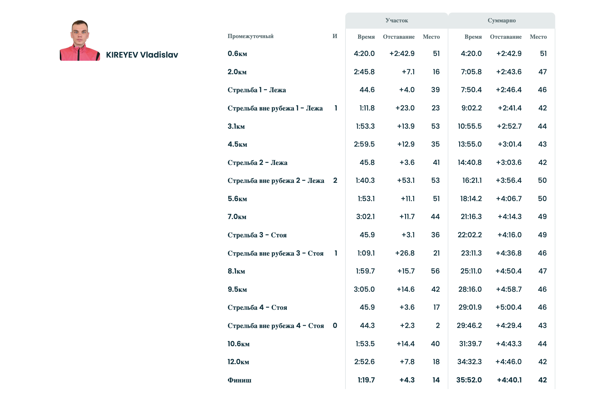 В гонке с четырьмя огневыми рубежами Киреев допустил четыре промаха и в итоге финишировал на 42-м месте.