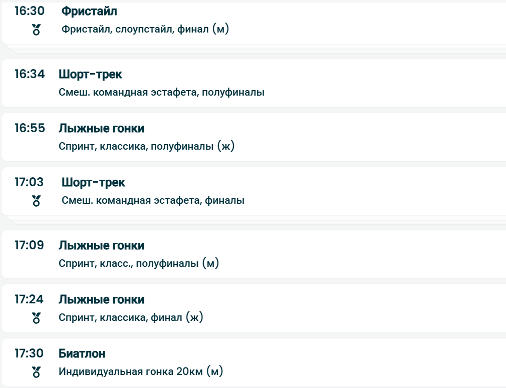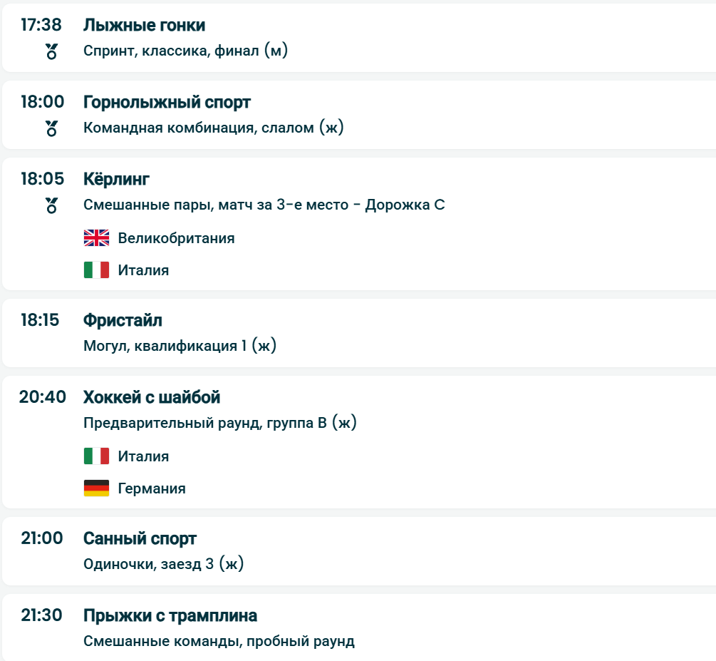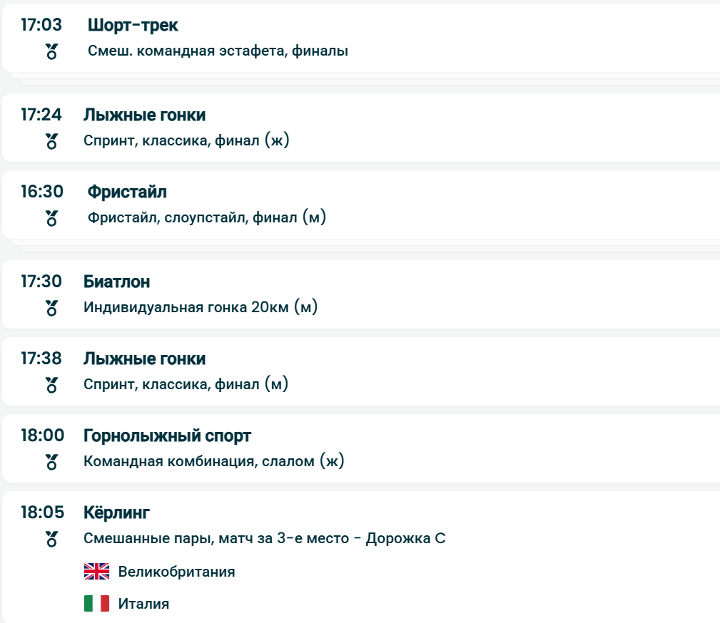 Программа дня включает финалы в шорт-треке, лыжных гонках, фристайле, горнолыжном спорте, керлинге и санном спорте.