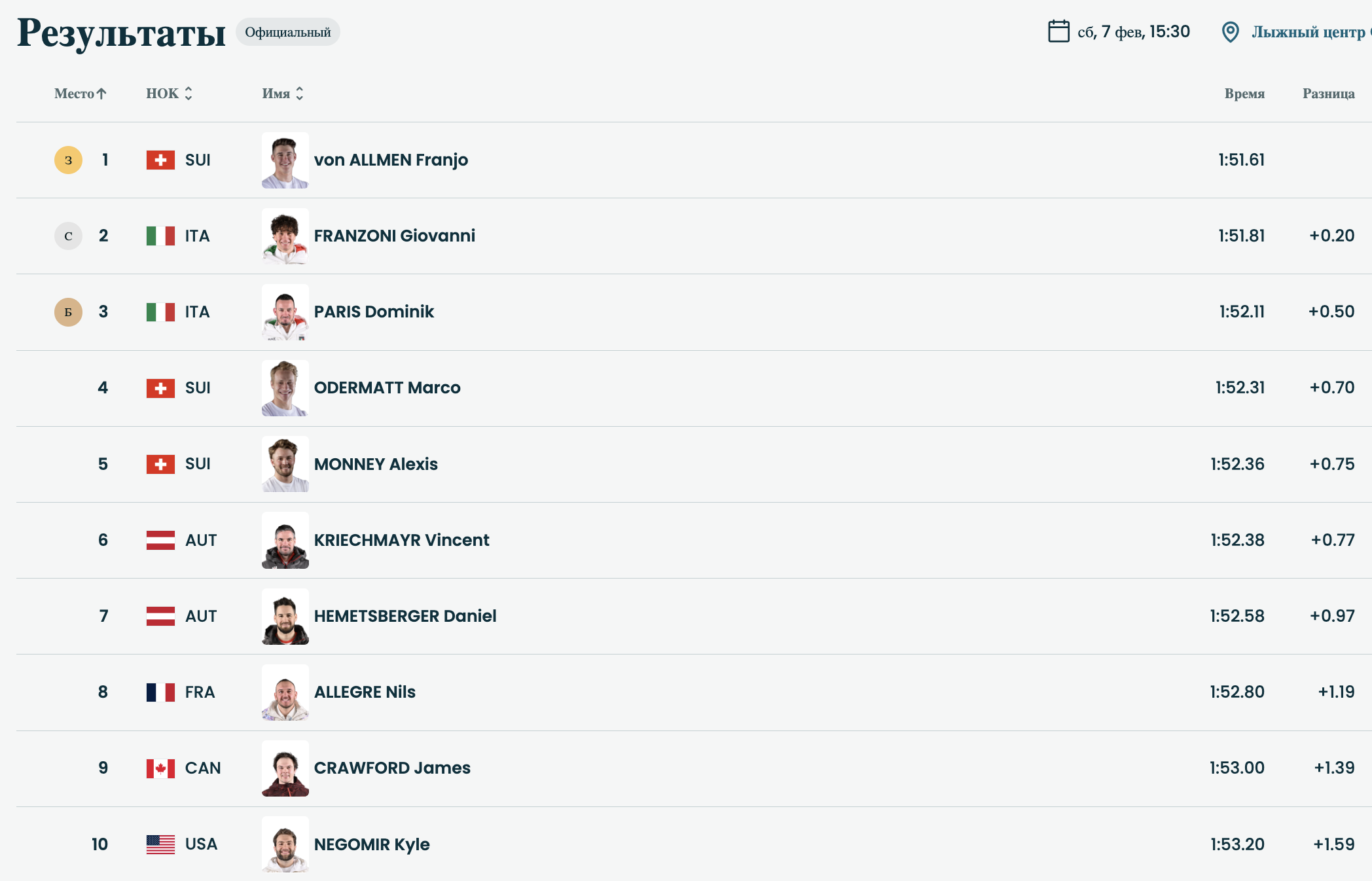 - Марко Одерматт (Швейцария) - +0,70.