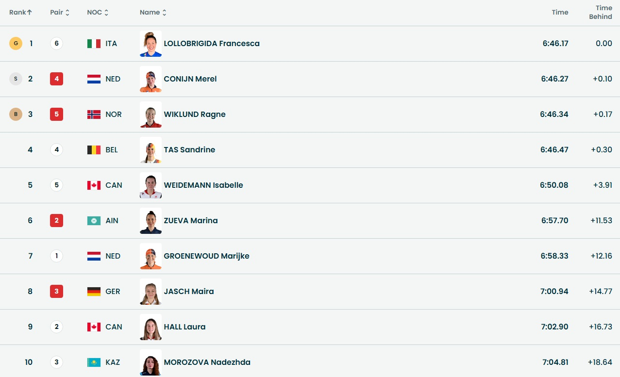 Олимпийской чемпионкой в этой дисциплине стала итальянская спортсменка Франческа Лолобриджида с результатом - 6:46.17. Морозова отстала от победительницы на 18.64 - ее время 7:04.81.