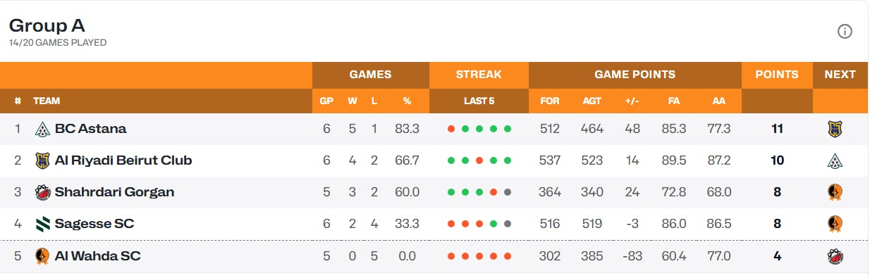 В таблице группы "А" "Астана" идет на первой позиции. 11 февраля "Астана" сыграет в Бейруте с местным "Аль-Рияди".