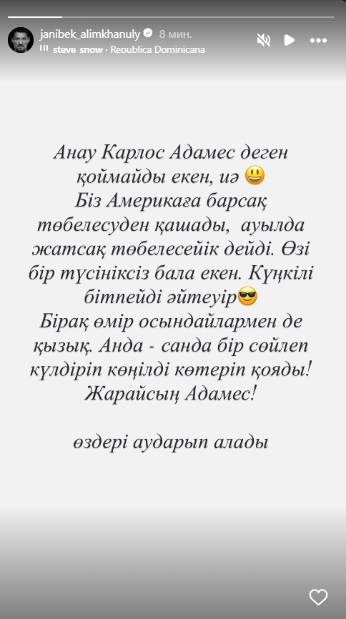 Этот Карлос Адамес не успокоится, да? Когда приезжаю в Америку убегает, когда лежу в ауле - зовет драться. Непонятный парень. Но жизнь интересна этим. Как скажет что-то, однозначно поднимает мне настроение! Хорош, Адамес!, - написал Алимханулы в сторис Instagram, добавив в тексте - "сами переведут".