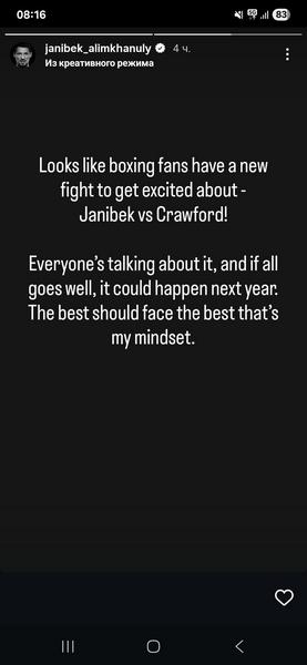Похоже, что фанаты бокса увлеклись новым боем - Жанибек против Кроуфорда! Все об этом говорят, и если всё пойдёт хорошо, он мог бы состояться в следующем году. Лучшие должны сражаться с лучшими - таков мой образ мышления, - написал Алимханулы в Instagram Stories.