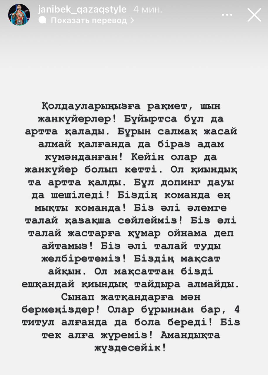 На своей странице в Инстаграм он опубликовал сообщение для болельщиков, в котором поблагодарил за поддержку после того, как у Алимханулы в крови была обнаружена запрещённая субстанция - мельдоний. По этой причине бой за три титула с чемпионом WBA кубинцем Эрисланди Ларой был отменен.