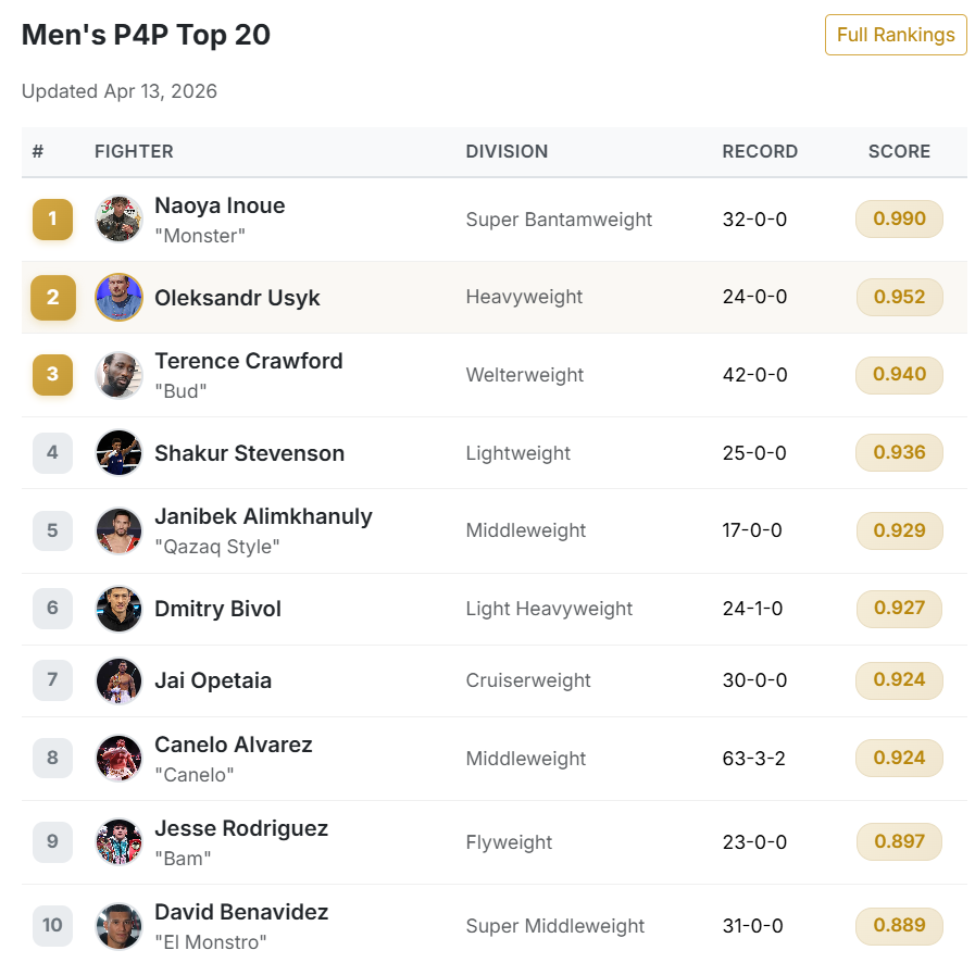 Топ-10 P4P от Boxing Metrics выглядит так: