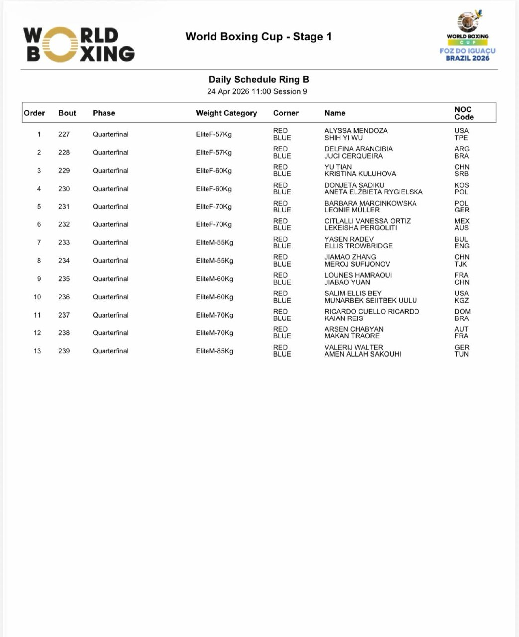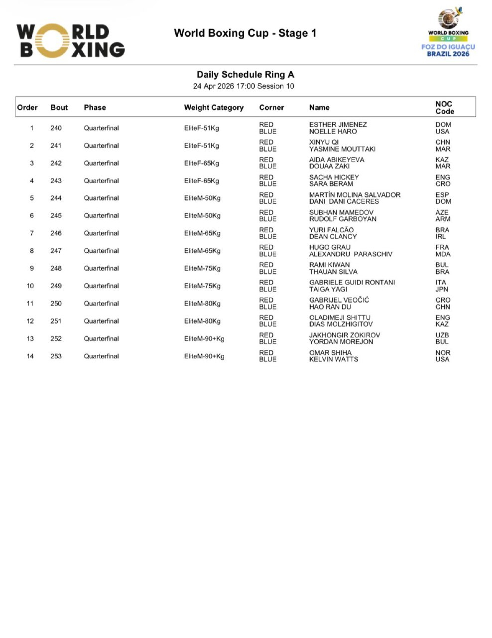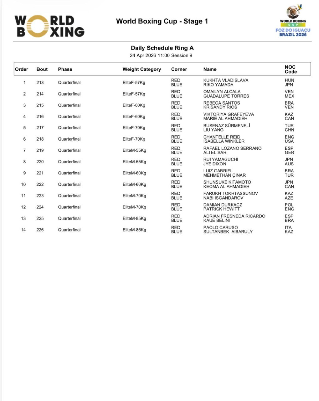 Расписание боев этапа Кубка мира в Бразилии - 24 апреля, вечерняя сессия