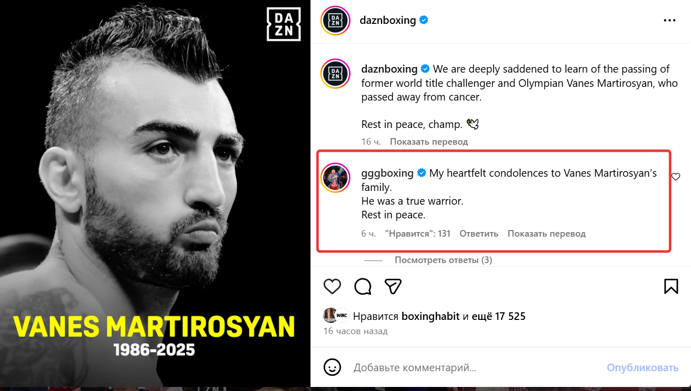 "Мои сердечные соболезнования семье Ванеса. Он был настоящим воином. Покойся с миром", - написал Головкин в комментариях к публикации DAZN.