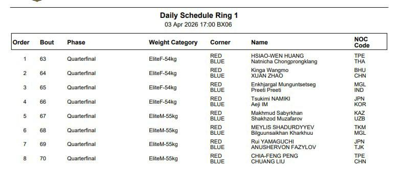 В вечерней сессии на ринг выйдет двукратный чемпион мира и чемпион Азии-2024 Махмуд Сабырхан. В четвертьфинале весовой категории до 55 кг он встретится с узбекистанцем Шахзодом Музаффаровым.