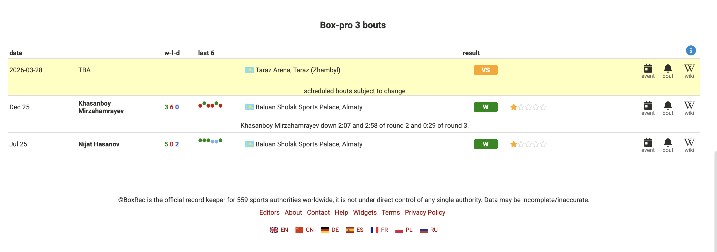 По информации BoxRec, бой состоится 28 марта в Таразе. Имя соперника на данный момент не раскрывается.