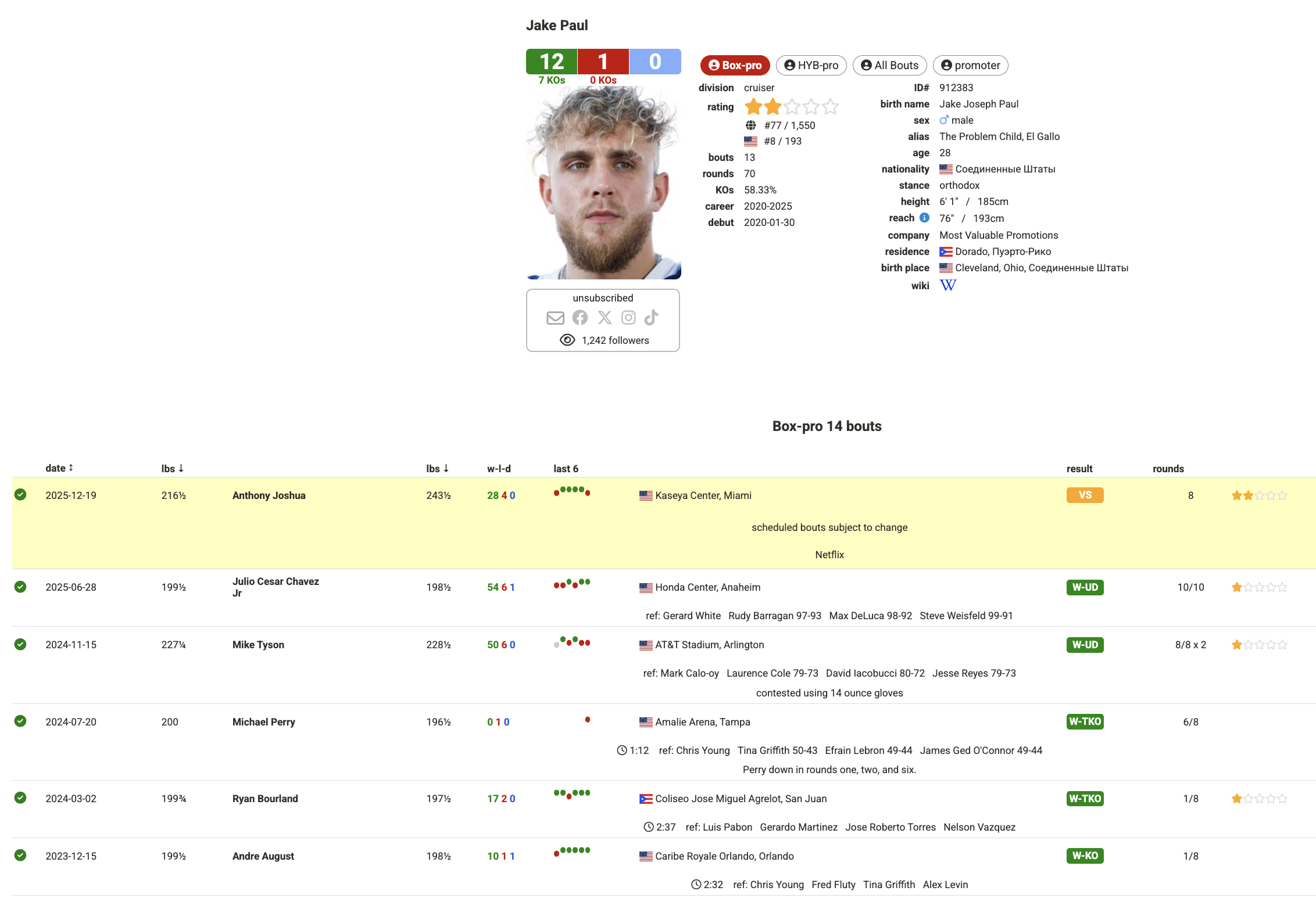 28-летний Пол входит в поединок на пике популярности: блогер собрал 12 побед при одном поражении, а его резонансная победа над Майком Тайсоном стала, по разным оценкам, самым рейтинговым спортивным событием в истории стриминга. После Пол единогласным решением судей победил Хулио Сезара Чавеса-младшего. Сейчас он идет на серии из шести побед.