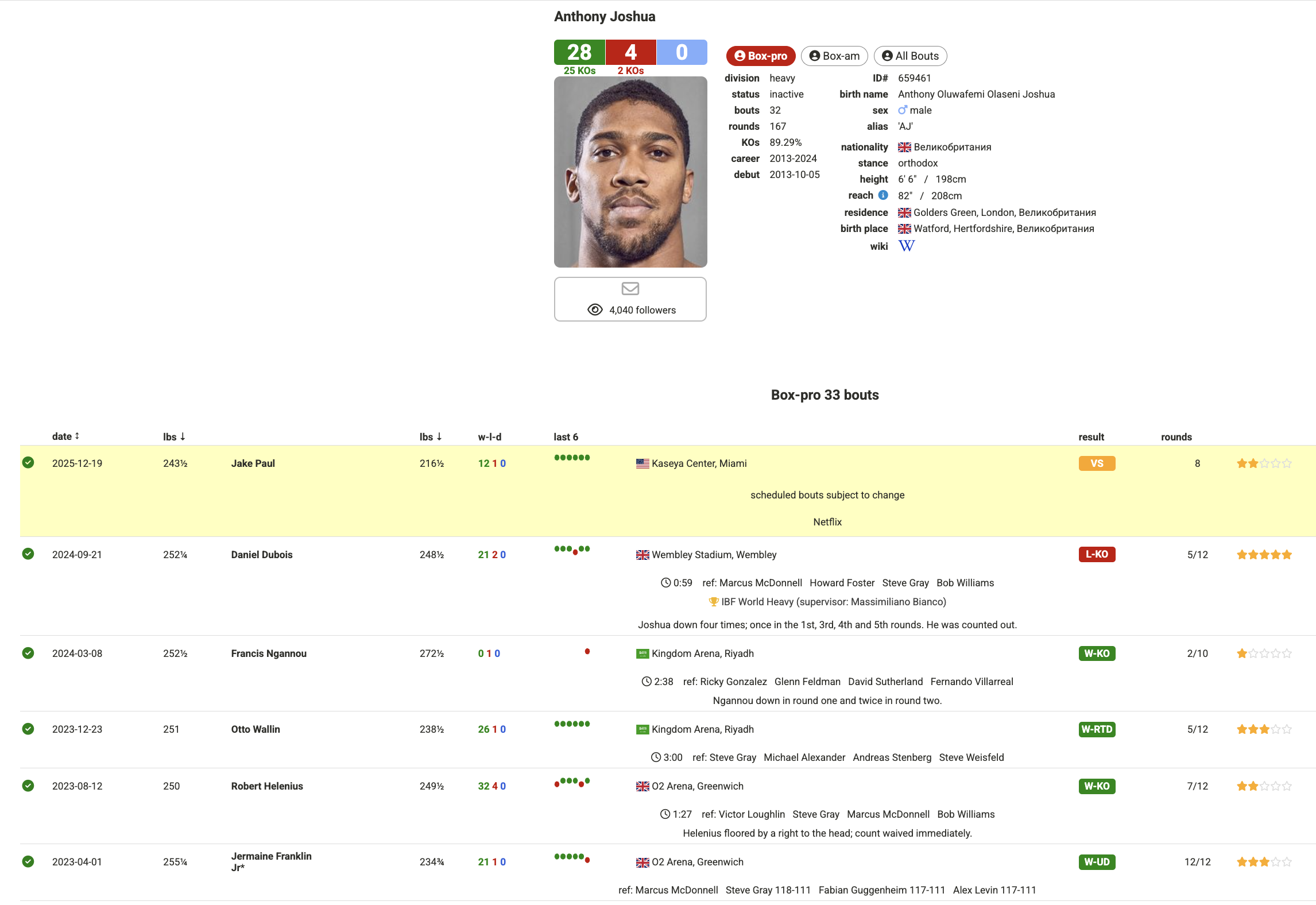 Для 36-летнего Джошуа это первый бой за год. Британец выходит после поражения нокаутом от Даниэля Дюбуа и стремится вернуть статус в топе супертяжёлого дивизиона. Его рекорд - 28-4, 25 побед нокаутом. При этом Джошуа считается явным фаворитом: эксперты ожидают досрочного завершения в первых раундах.