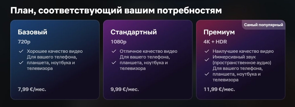 Netflix предлагает несколько тарифов по разным возможностям (качество видео и количество устройств):