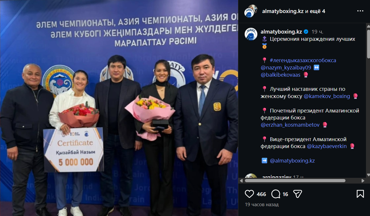Кроме нее Федерация бокса отметила и самую титулованную казахстанку Назым Кызайбай, которой вручили сертификат на сумму 5 миллионов тенге. В марте 2025 года Назым стала стала трёхкратной чемпионкой мира, а не первом турнире World Boxing завоевала серебро.