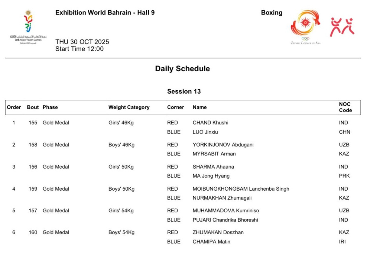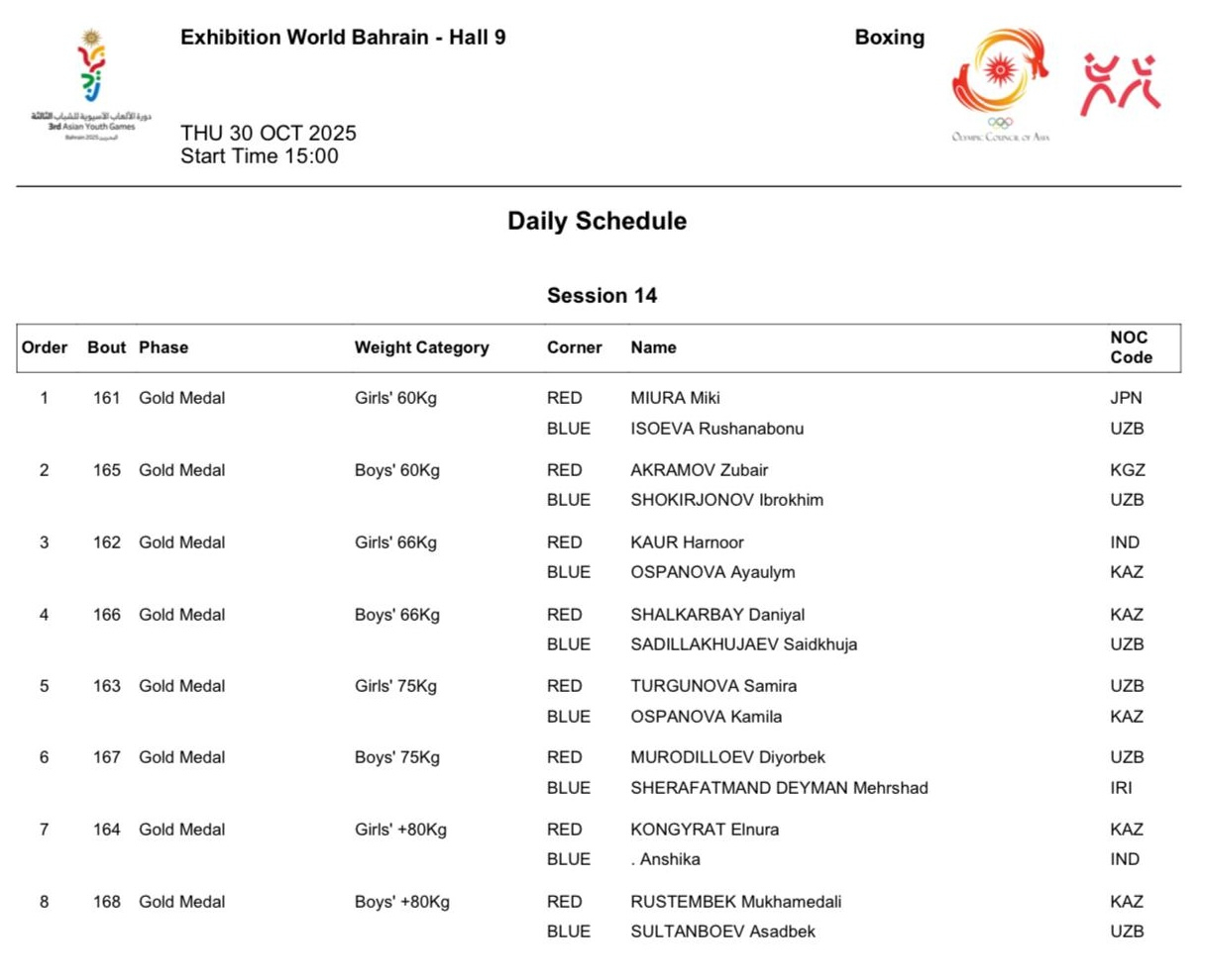 У Казахстана в финалах восемь боксеров - три девушки и пять парней: Аяулым Оспанова, Камила Оспанова, Эльнура Конырат, Арман Мырсабит, Жумагали Нурмахан, Досжан Жумахан, Даниял Шалкарбай и Мухаммедали Рустембек.