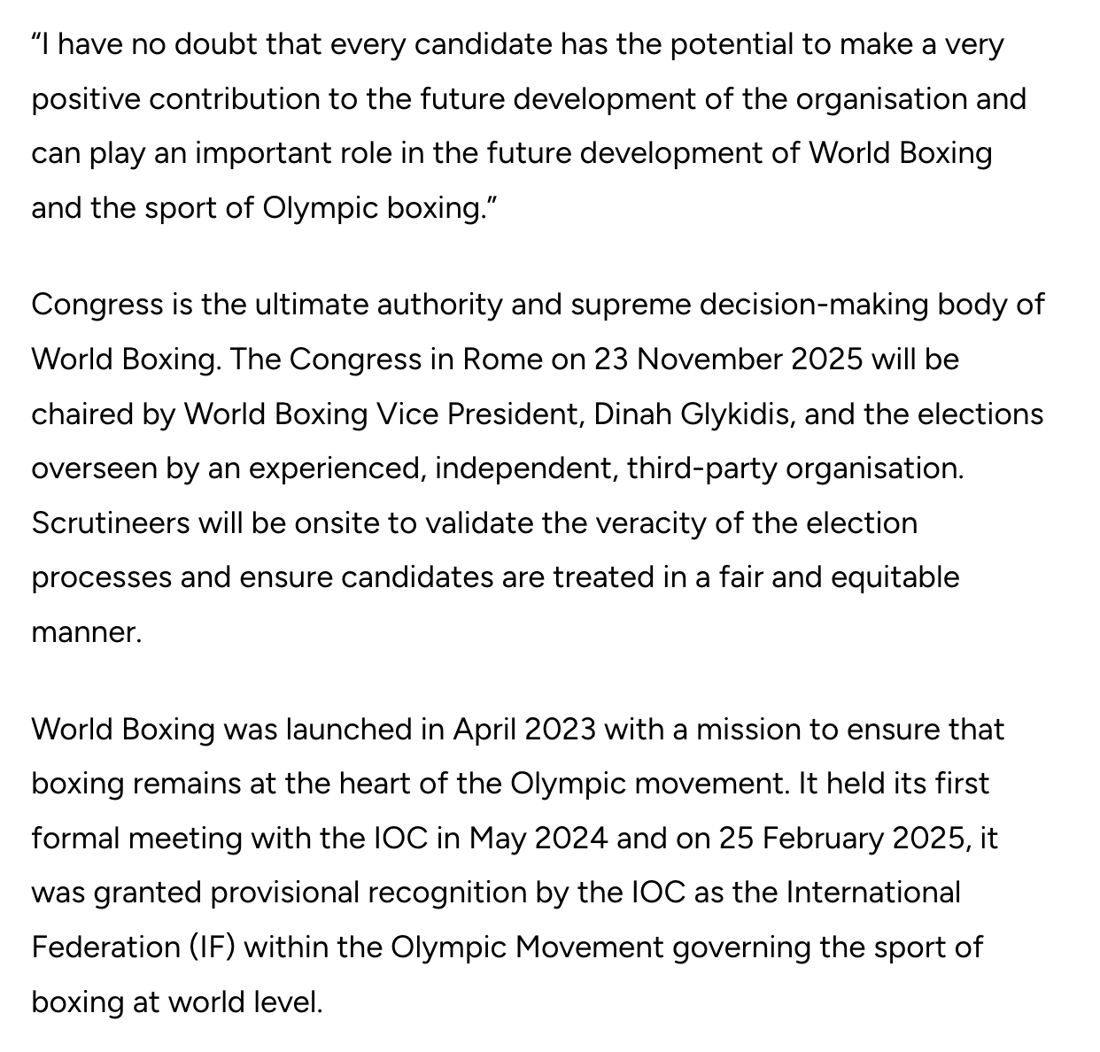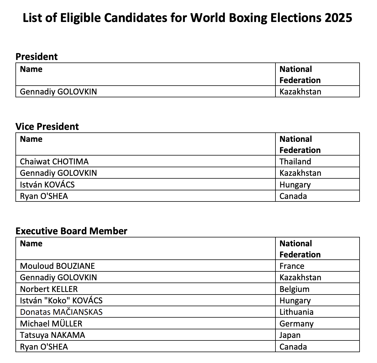 Опубликован окончательный список кандидатов, допущенных к выборам на Конгрессе World Boxing 2025, который пройдет 23 ноября в Риме, сообщает Спорт Шредингера.