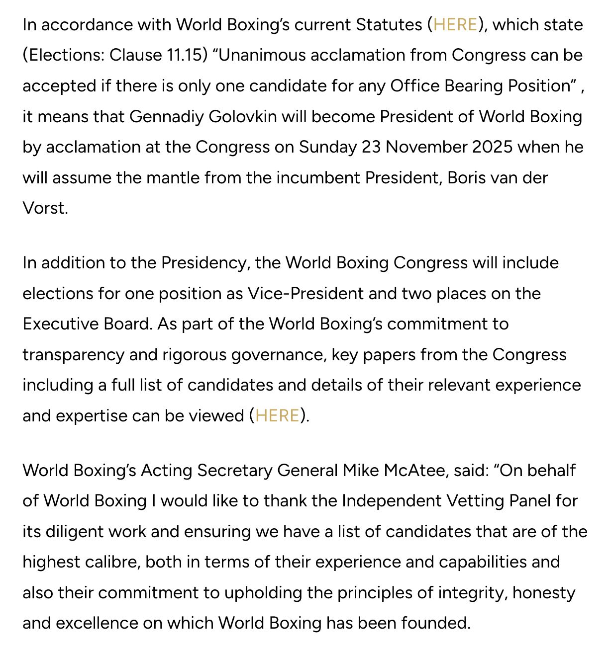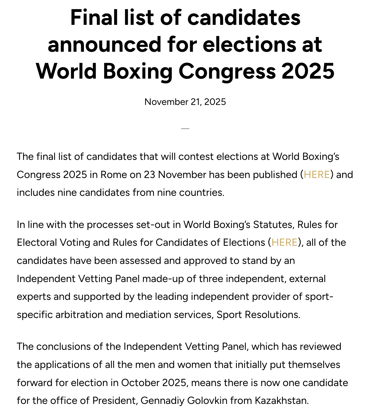 По итогам проверки на должность президента допущён только Головкин. Согласно Уставу World Boxing (п. 11.15), если на пост выдвинут один кандидат, его утверждение проходит путём аккламации - единогласным одобрением Конгресса без голосования. Таким образом, Головкин должен стать новым президентом World Boxing - 23 ноября, сменив на этом посту Бориса ван дер Ворста.