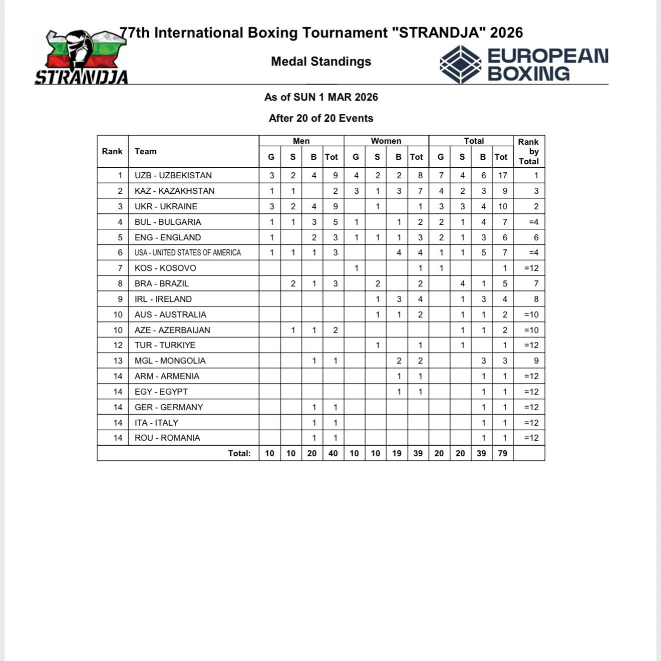 Сборная Узбекистана вновь подтвердила свой статус одной из сильнейших команд турнира, став лидером по общему числу медалей. Мужская и женская команды в сумме заняли первое место в общекомандном зачёте: