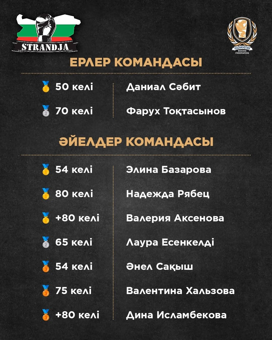 Мужчины: 1 золото (Даниял Сабит, 50 кг), 1 серебро (Фарух Токтасынов, 70 кг)