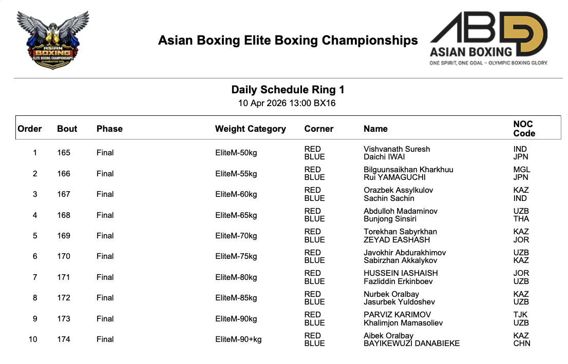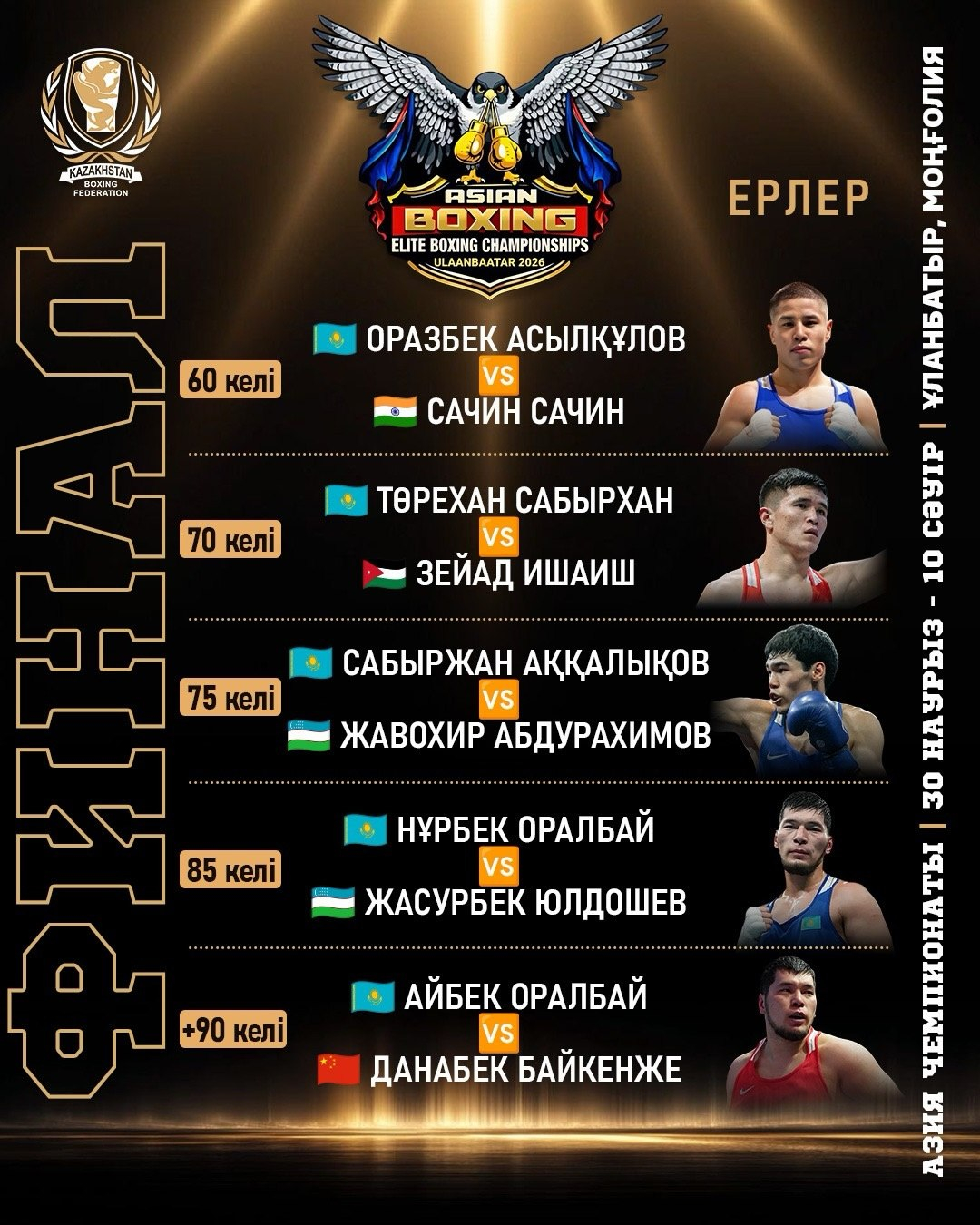 Начало финалов - в 10:00 по времени Казахстана. У Казахстана будет пять финалов в мужском боксе - два против Узбекистана, один против Индии, Иордании и Китая.
