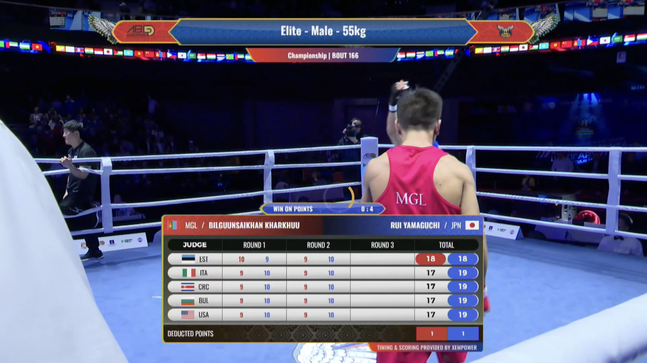 - 55 кг: Билгуунсайхан Хархуу (Монголия) - Руи Ямагучи (Япония) - 0:4 (досрочная остановка из-за травмы)