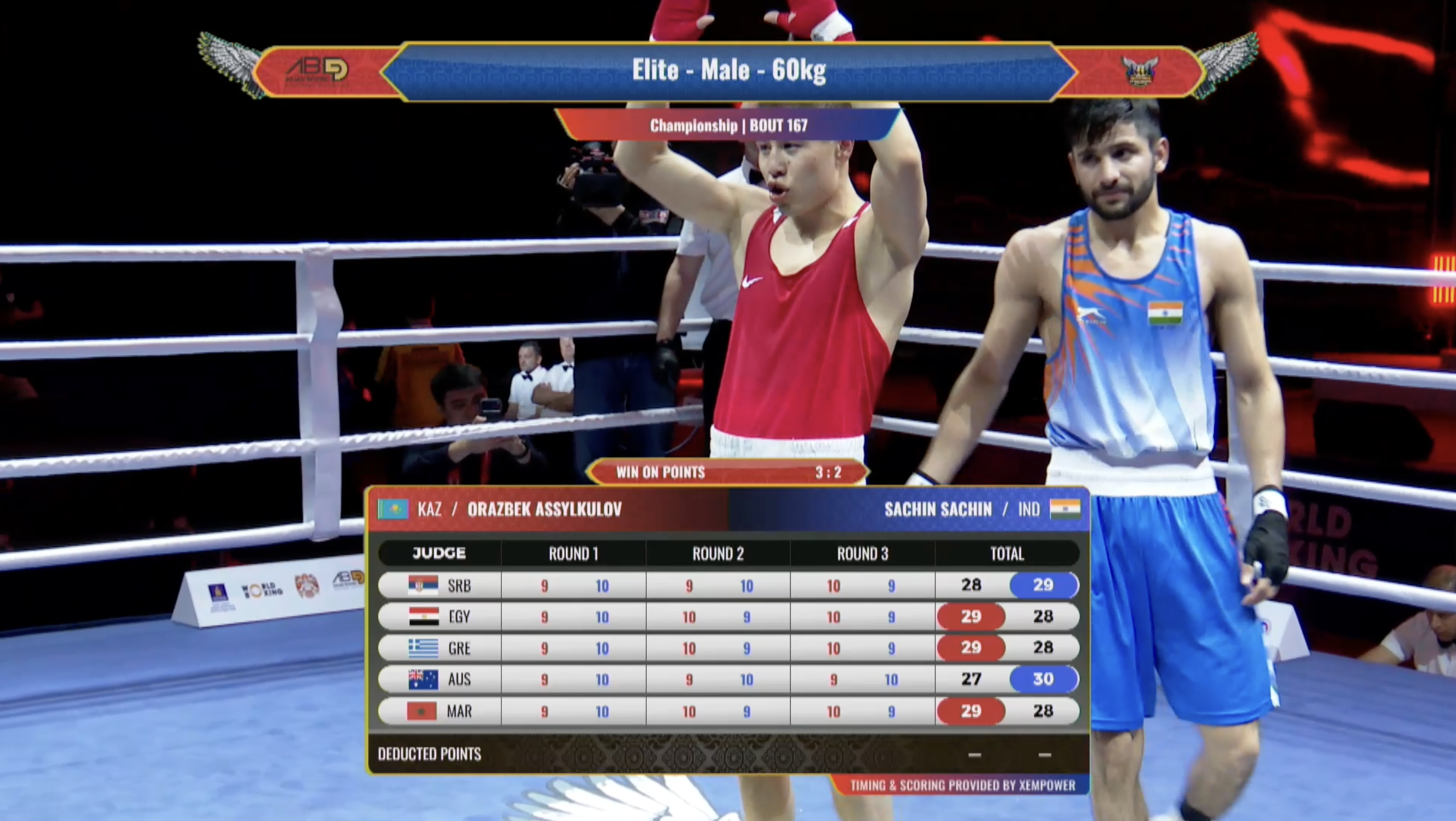 - 60 кг: Оразбек Асылкулов (Казахстан) - Сачин Сачин (Индия) - 3:2