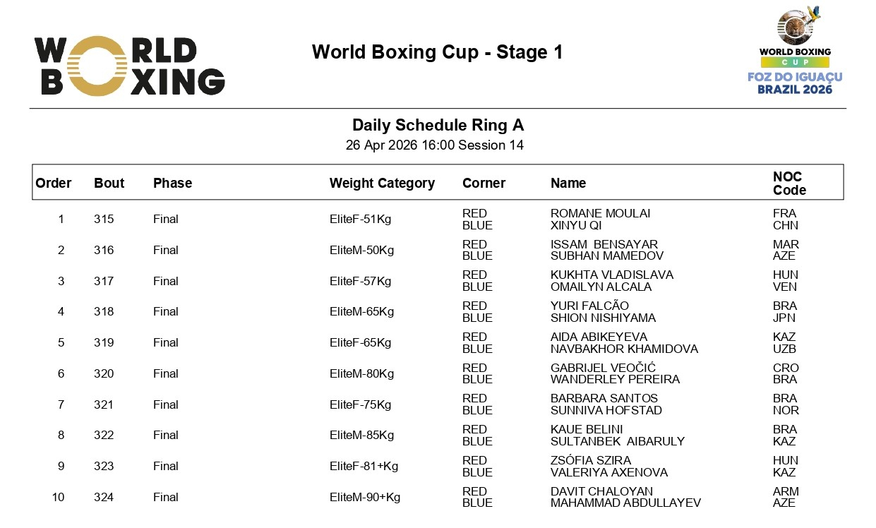 26 апреля и в ночь на 27 апреля четыре казахстанских боксеров выступят в финалах этапа Кубка мира от World Boxing в бразильском Фос-ду-Игуасу, сообщает Спорт Шредингера.