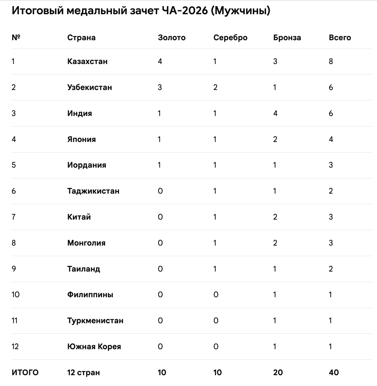 В Улан-Баторе завершился чемпионат Азии по боксу-2026, где мужская сборная Казахстана заняла первое место в общекомандном медальном зачёте, опередив Узбекистан и Индию.