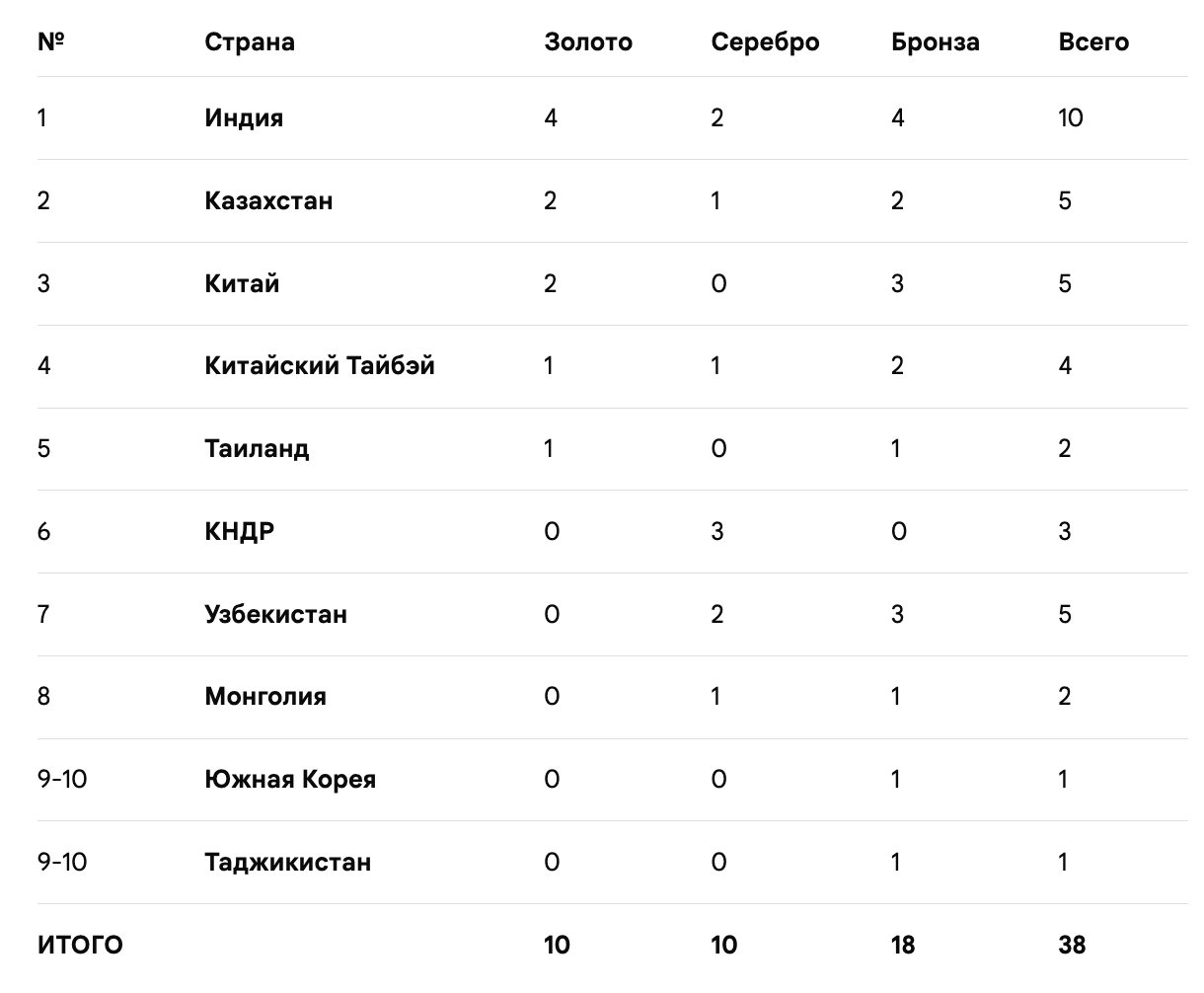 Общий зачет выиграла Индия, которая взяла 11 медалей: 5 золотых, 2 серебряных, 4 бронзовых. Казахстан занял второе место с 5 призерками, опередив Китай за счет финалисток - 2 золота, 1 серебро, 2 бронзы. Седьмым стал Узбекистан, оставшийся без золота - 2 серебра и 3 бронзы.