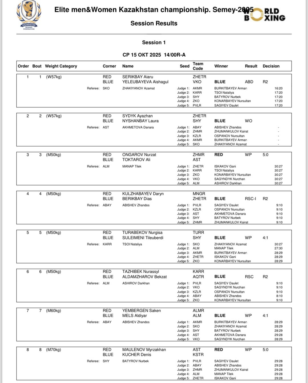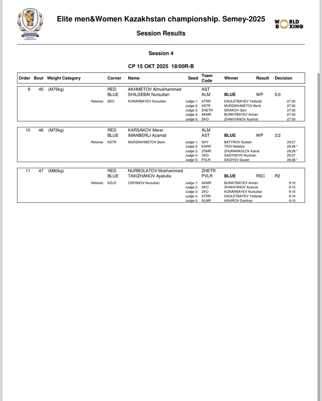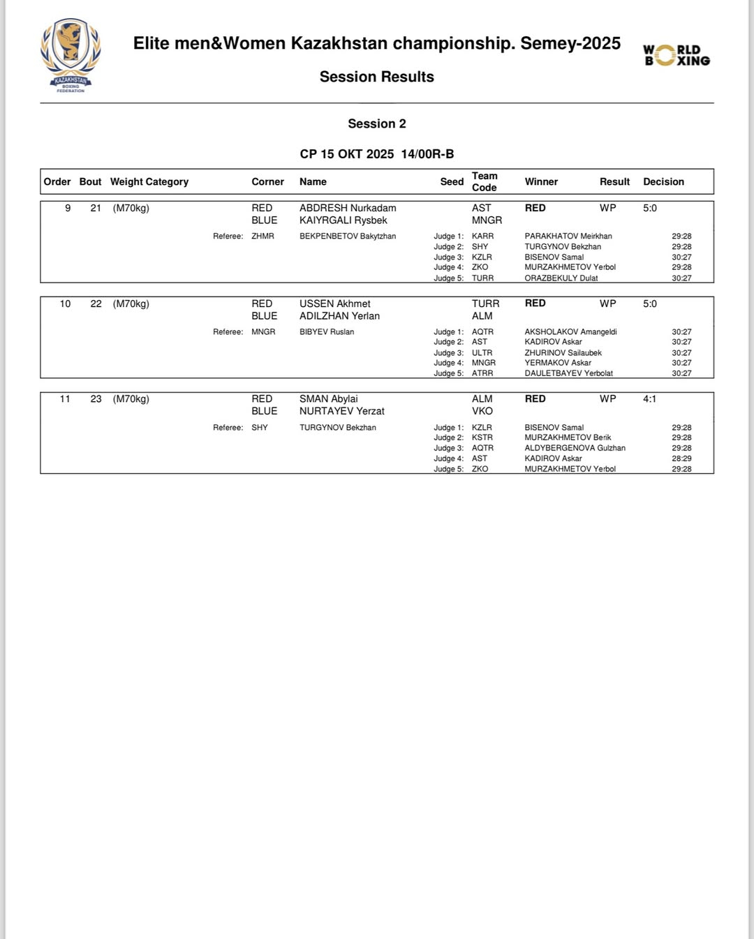 - Ахмет Уссен (Туркестанская обл.) – Ерлан Адильжан (Алматы) — 5:0