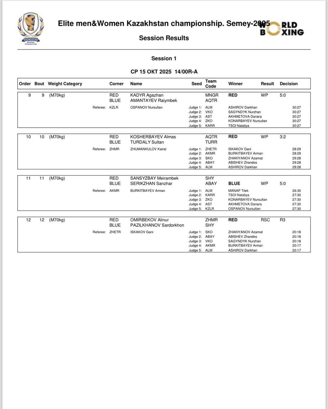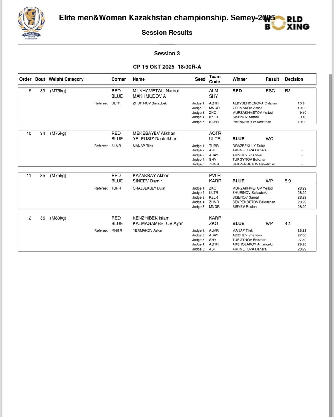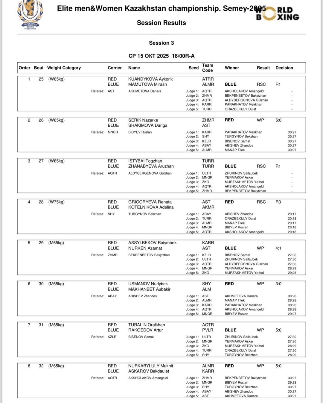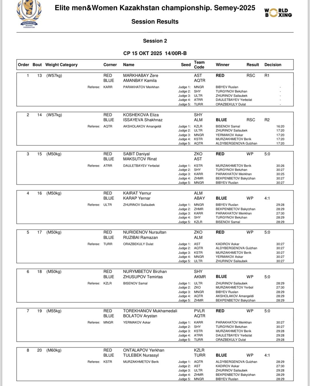 - Ахмет Уссен (Туркестанская обл.) – Ерлан Адильжан (Алматы) — 5:0