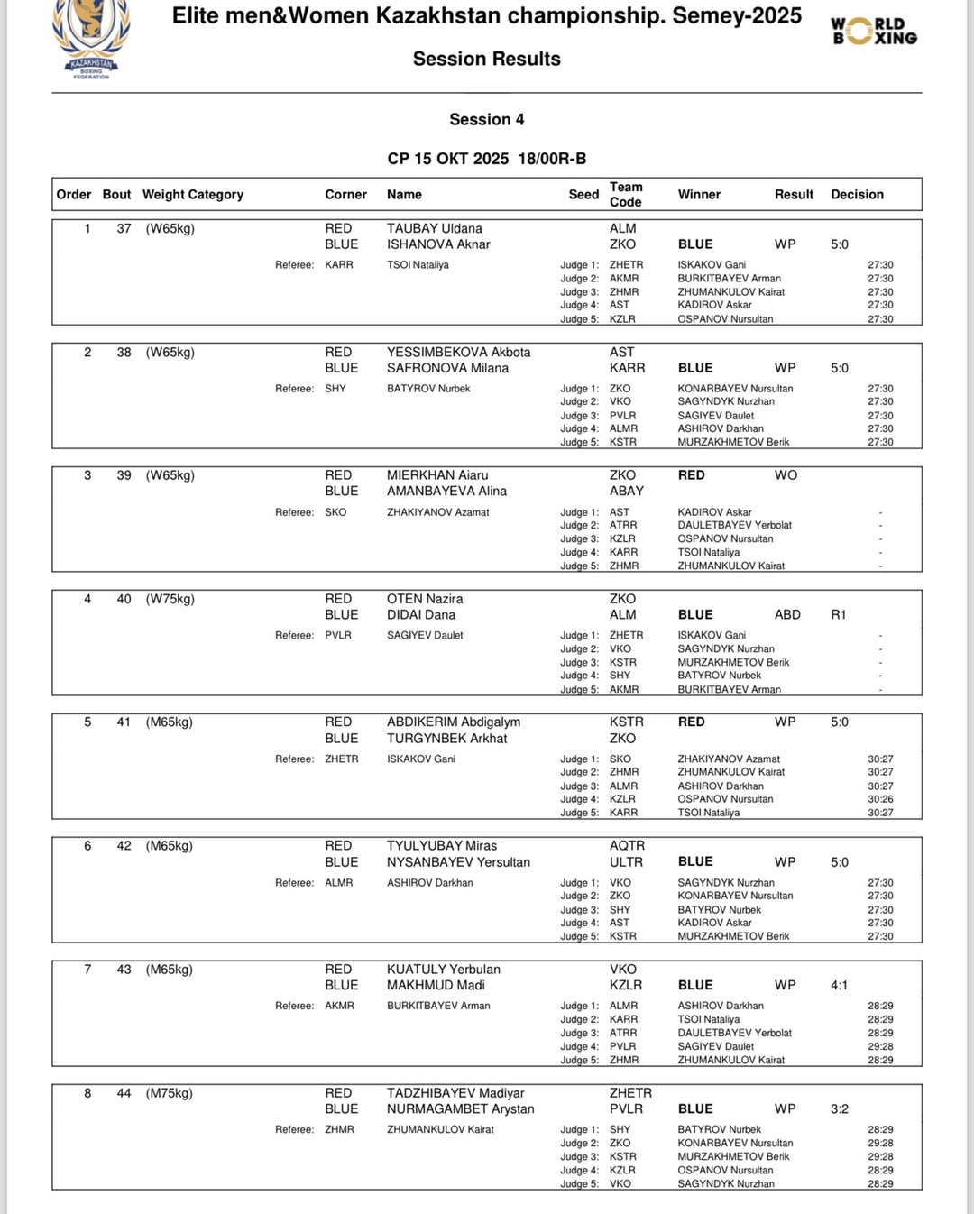 - Улдана Таубай (Алматинская обл.) – Акнар Ишанова (Западно-Казахстанская обл.) — 0:5