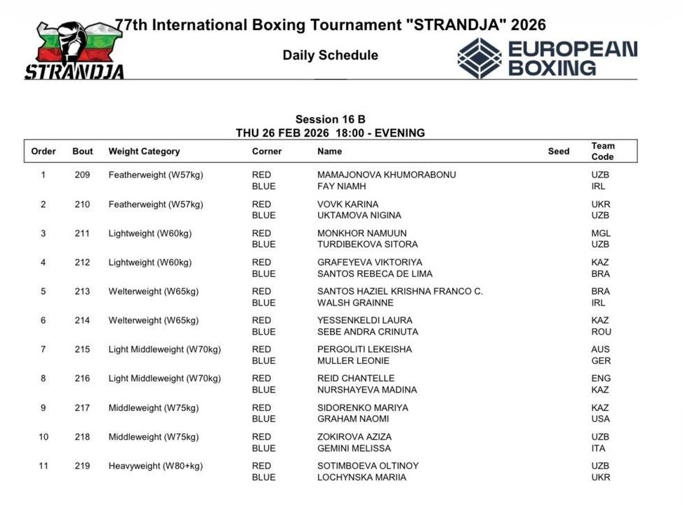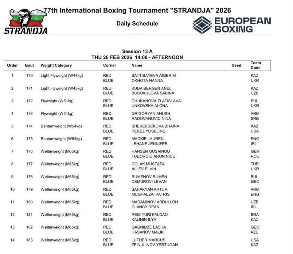 Соревнование проходит в Софии (Болгария). Поединки пройдут в две сессии. Дневная сессия стартует в 17:00, вечерняя начнётся в 21:00 по казахстанскому времени. Прямая трансляция поединков будет доступна позже.
