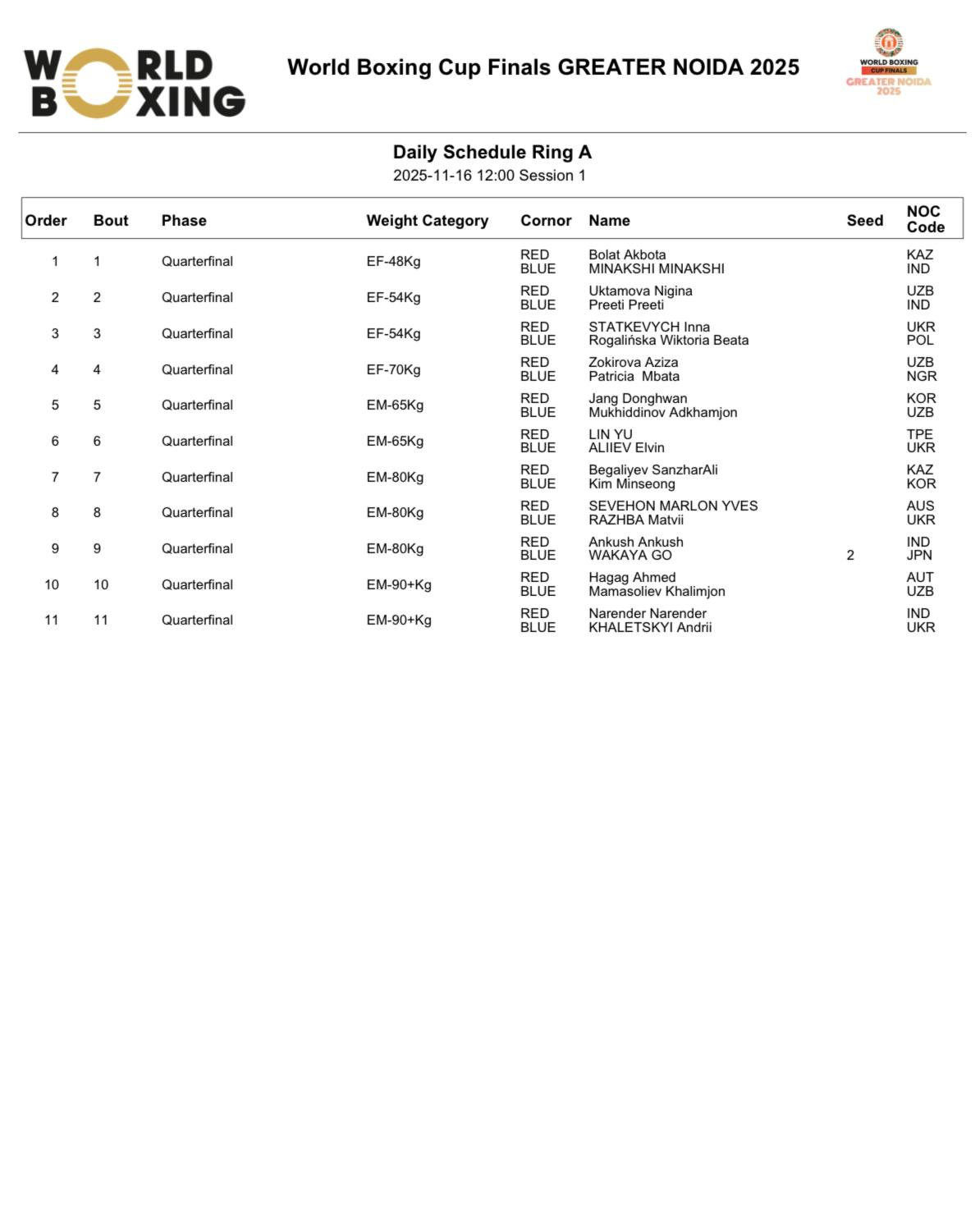 Противостояния стартуют в 14:00 по казахстанскому времени. Одной из первых на ринг в категории до 48 килограмм выйдет Акбота Болат, которая сразится с Минакши Минакши из Индии.