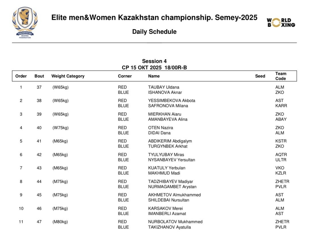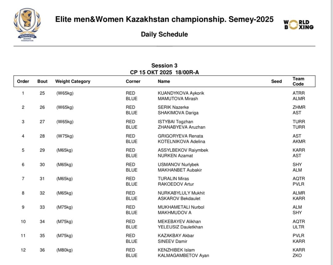 - Ислам Кенжибек (Карагандинская область) vs Аян Калмагамбетов (Западно-Казахстанская область)