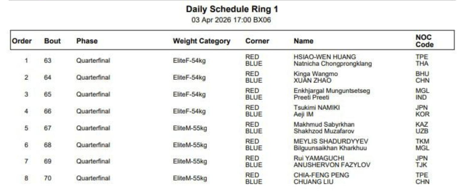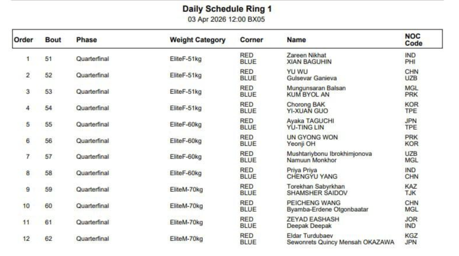 В дневной программе 3 апреля выступит Торехан Сабырхан. В четвертьфинале весовой категории до 70 кг казахстанец встретится с представителем Таджикистана Шамшиером Саидовым. Соперник известен победой на турнире Elorda Cup-2023 в Казахстане, где он победил сразу нескольких местных боксёров.