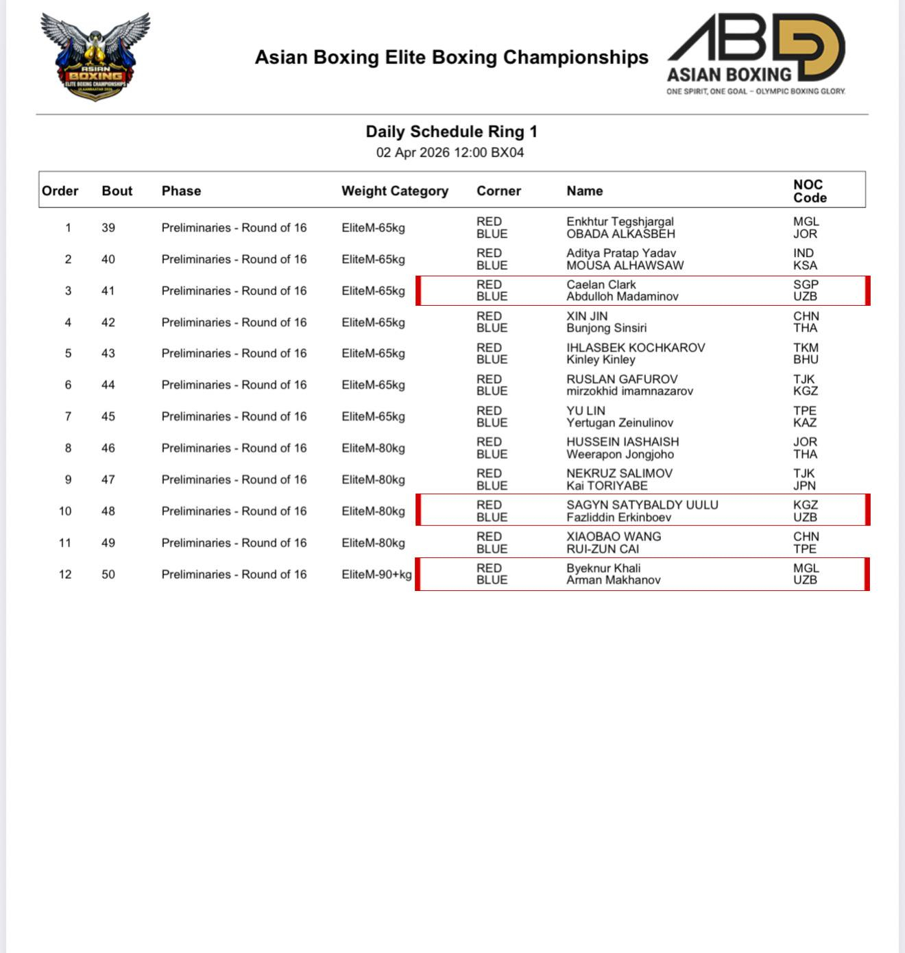 В 1/8 финала весовой категории до 65 кг Абдуллох Мадаминов встретится с боксером из Сингапура Каелан Кларк.