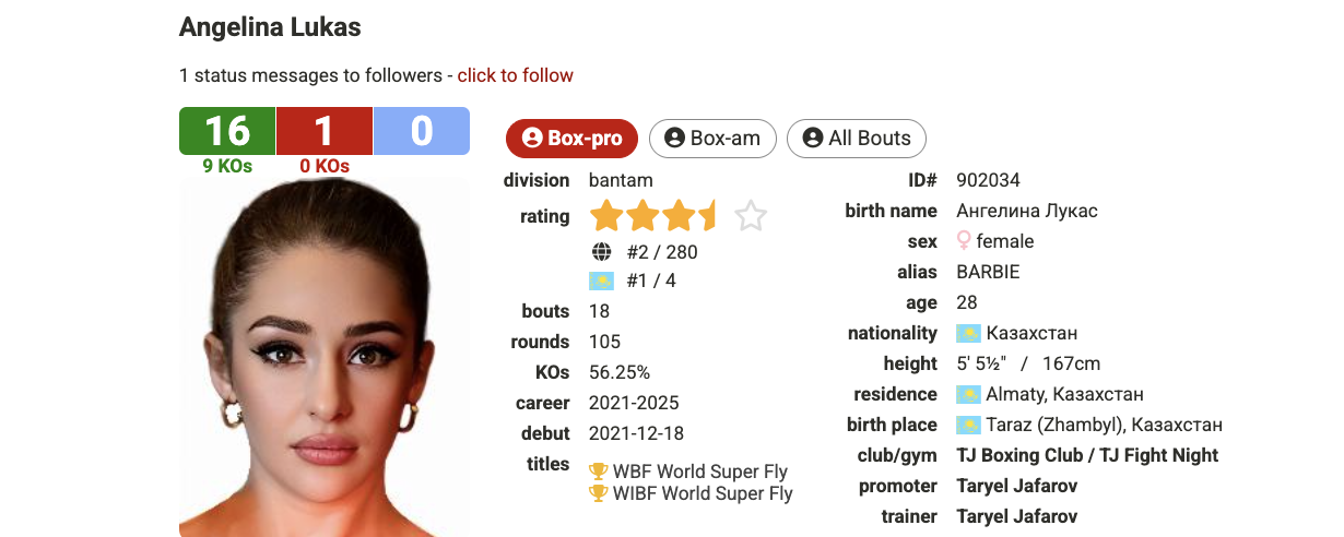 Чемпионка мира по боксу во втором наилегчайшем весе по версии WBF Ангелина Лукас в ближайшее время получит второе поражение в своей карьере, сообщает Спорт Шредингера со ссылкой на телеграм-канал "Дядя Ваня".