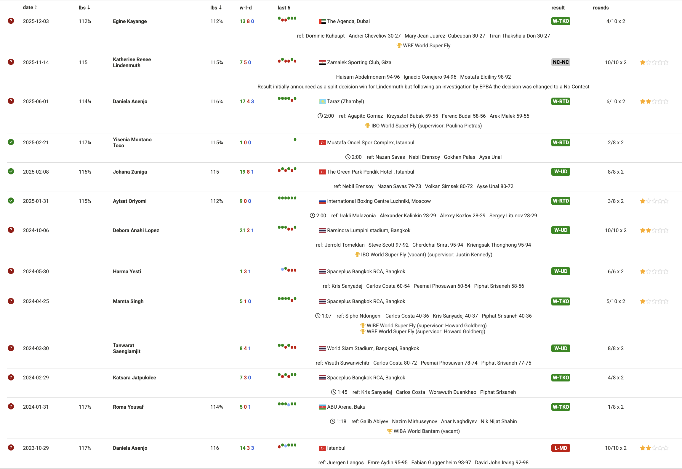 Кэтрин Линденмут - победа раздельным решением судей над Ангелиной Лукас - признанная и санкционированная Всемирной боксёрской ассоциацией.