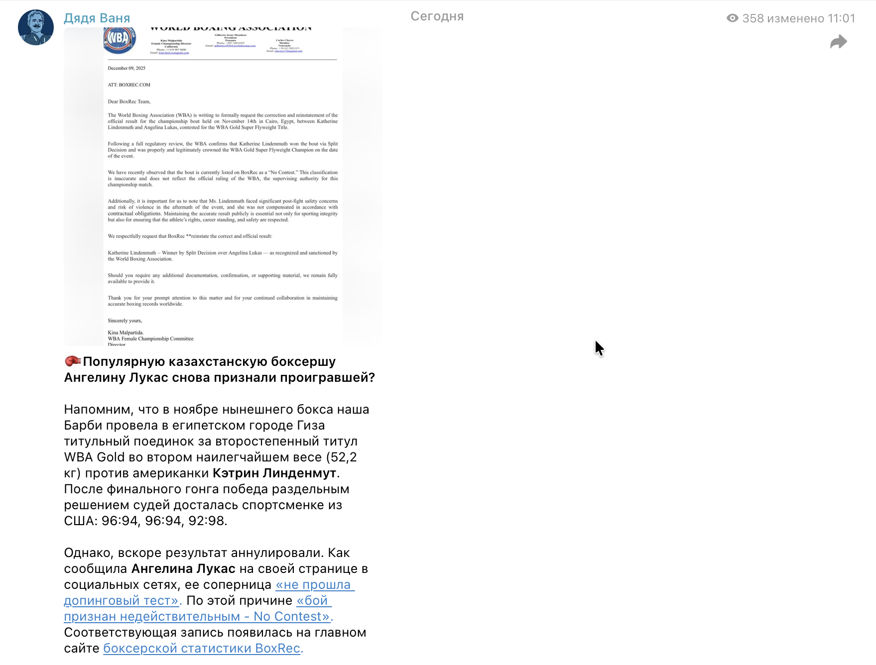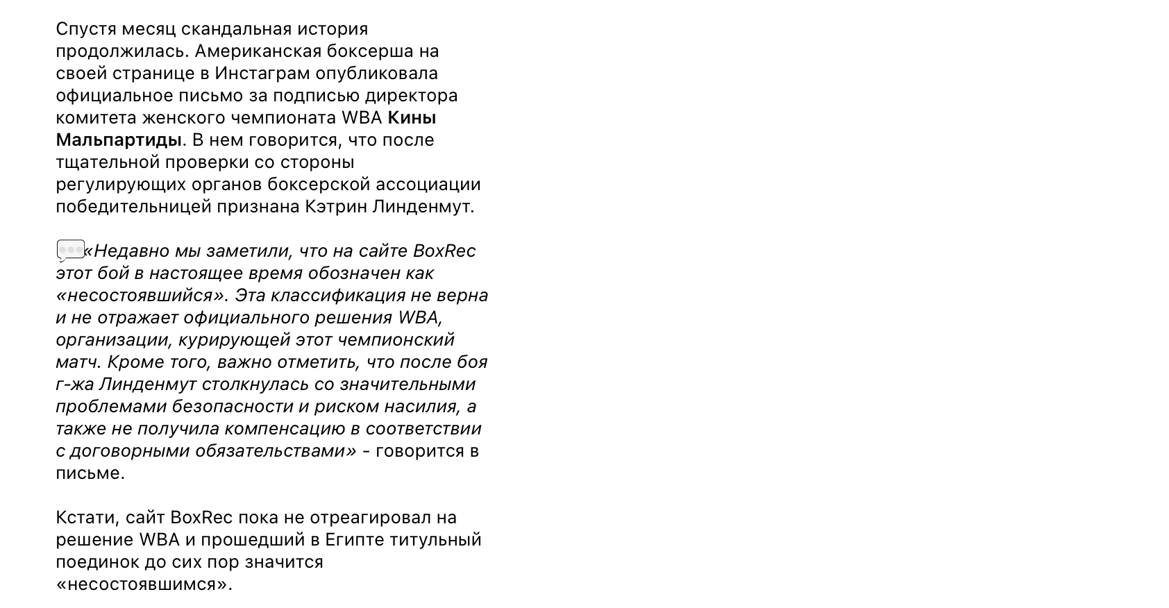 Теперь с заявлением выступила Линдемут, которая опубликовала в социальных сетях официально письмо от директора организации WBA Кины Мальпартиды. В нем говорится, что после "тщательной проверки" победительницей боя с Лукас признана Линдемут.